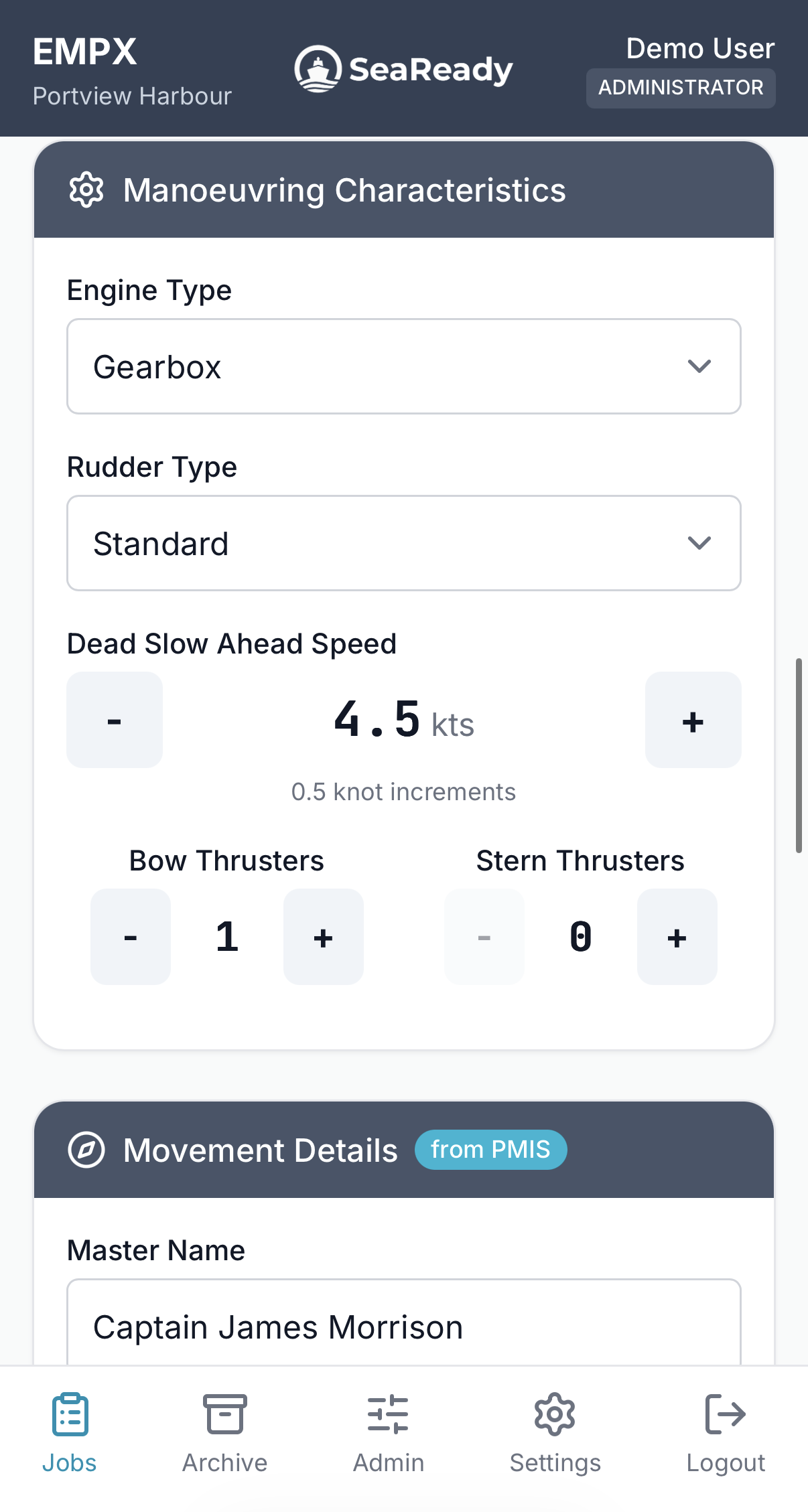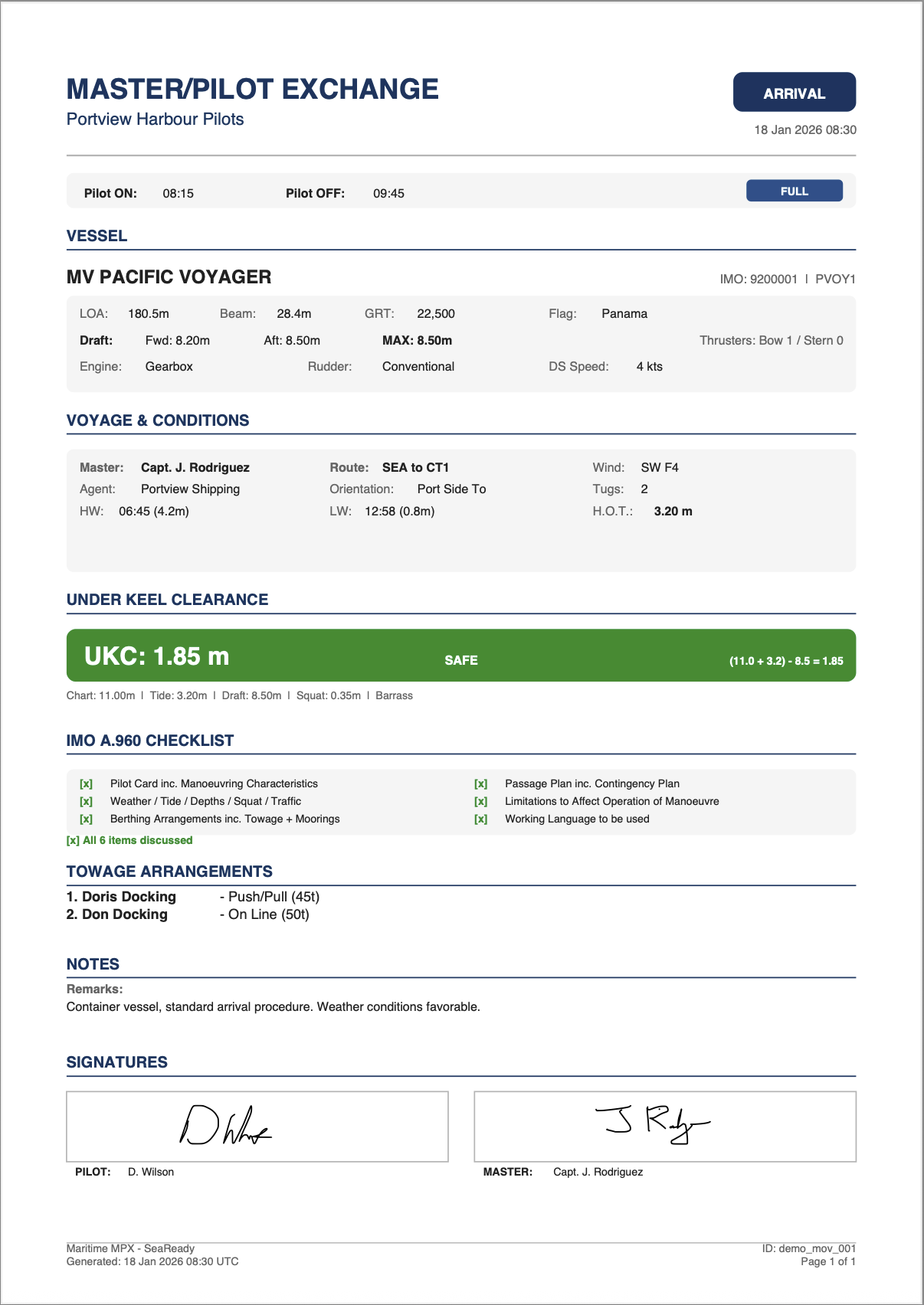 - PMIS Auto-Population: Vessel particulars (name, LOA, beam, draft), berth assignments, tug allocations, and timing data flow directly from the harbour's Port Management Information System—eliminating manual transcription errors.